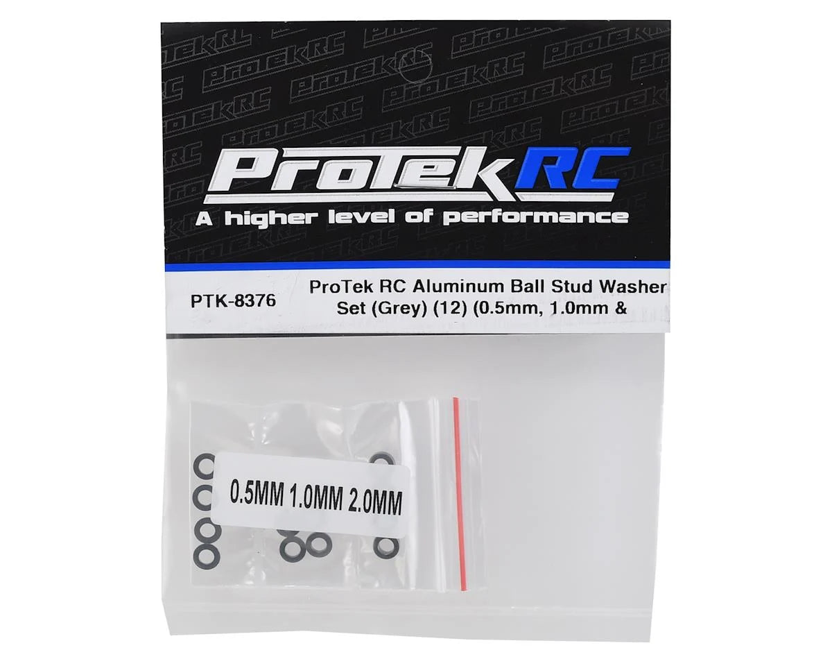 This ProTek R/C Aluminum Ball Stud Washer Set includes 3x5.5mm Grey anodized aluminum washers in the following thicknesses: 0.5mm, 1.0mm and 2.0mm. There are four washers included for each thickness, equaling twelve washers total.