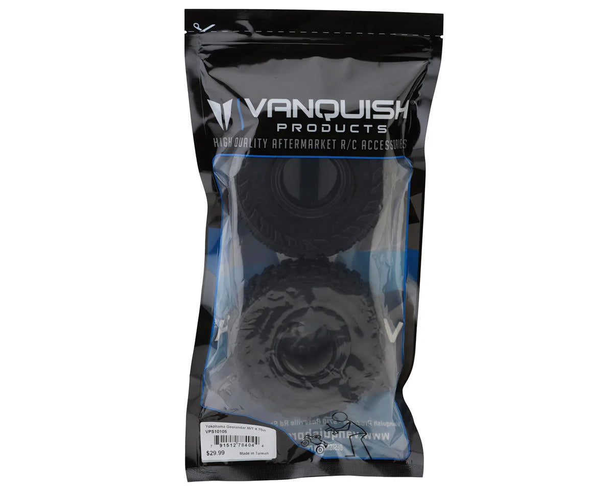 Vanquish Products Yokohama Geolandar M/T 1.9" Rock Crawler Class 2 Tires. Officially licensed by Yokohama Geolandar to Vanquish Products, these Geolandar tires are the ultimate performance and scale realistic class 2 competition tires that Vanquish molded with their legendary sticky rubber to provide maximum grip! Elevate your 1/10 rock crawler performance and scale appearances with these Yokohama Geolandar M/T 1.9" tires! providing crushing performance, intimidating looks, and outstanding tread life